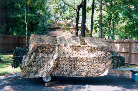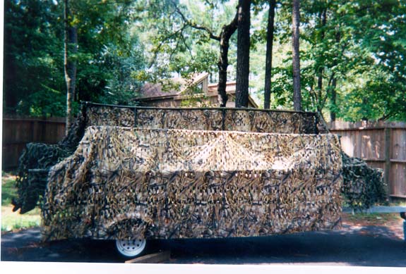 Here is the rear piece of camouflage attached to it's horizontal support. This is a piece of cerex in the Advantage Wetlands pattern with military camo netting on the ends. To attached the cerex, I first ripped a piece of 1" PVC length wise. I then place the top of the cerex along the support, then placed the strips of PVC along the cerex. I then used a power driver to screw ½" sheet metal screws through the PVC & the cerex, into the support. I placed a screw about every foot.