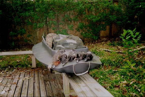 The results of an earlier diver hunt. Shown are my first redheads and 3 bluebills. They are resting on bow of my 4 Rivers layout. You can also see a bag of 2 dozen diver dekes snugged into the front and the reclining seat in the back. The end of the kayak paddle is sticking out also.