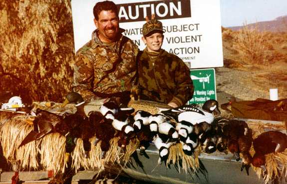 Buddy with a limit of greenheads. Notice the decoys in the bag on the stern.