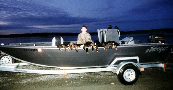 rig in about 40' of water. Go figure! This boat has a camo net blind on it when