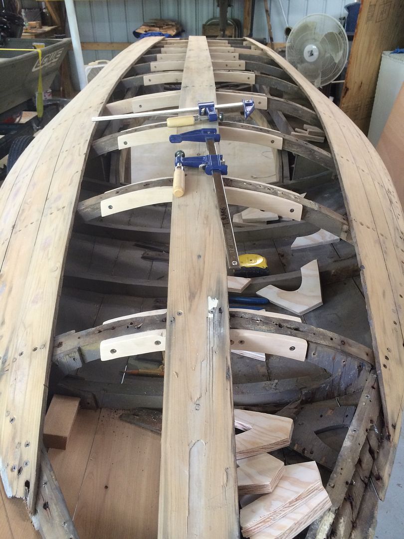When I did this I decided to replace as much stuff as I could. I re did all the gussets with 1/2 inch fir plywood. (Thanks Tod and others who stopped me from using okoume on this traditional build). I then replaced the small plywood pieces on the hull that held the framing members together with 1/2 cedar.