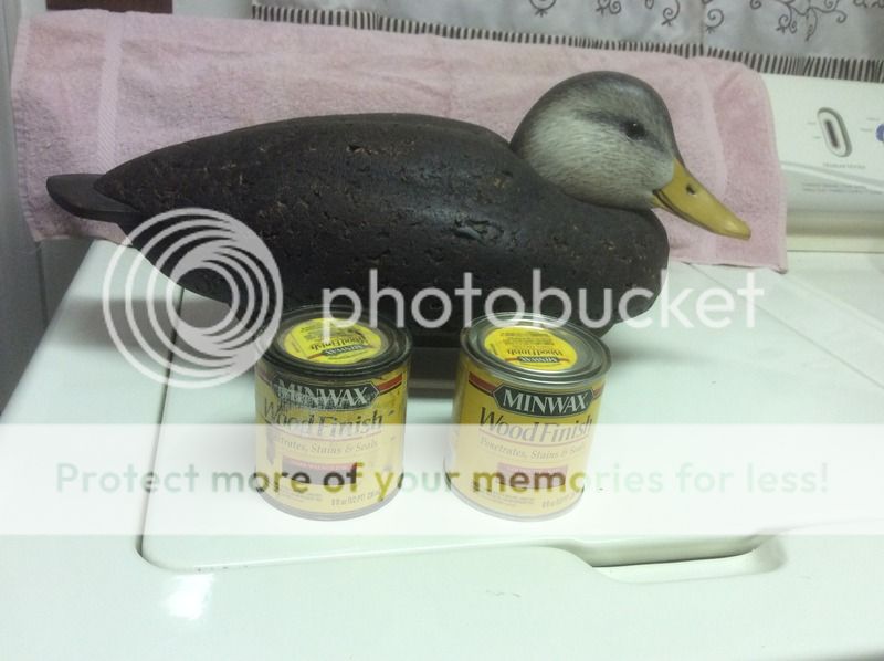 2ND STEP. USING MINWAX OIL STAIN AGAIN BUT A DIFFERENT COLOR DARK WALNUT #2716, WET A RAG WITH STAIN, RING OUT SO AS NOT TO HAVE COLOR RUN INTO THE VOIDS THAT HAVE THE 1ST COAT COLOR IN THE VOIDS.THEN JUST WIPE ON OVER THE WHOLE BODY TILL YOU ARE SATISFIED WITH FINISH DARK BROWN COLOR WITHOUT FILLING IN 1ST COLOR IN THE VOIDS, SO THAT THE FINISHED BIRD LOOKS LIKE FEATHER EDGES & YOU HAVE THE LOOK YOU WANT . I HAVE BEEN VERY HAPPY WITH SEALING OF THE DECOY AS WELL THE RESULTS OF STOOLING BLACK DUCKS TO THEM . SEE FINISHED PHOTOS.