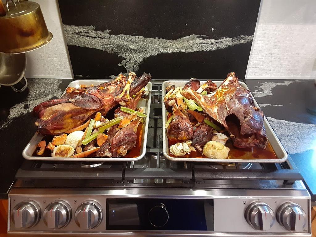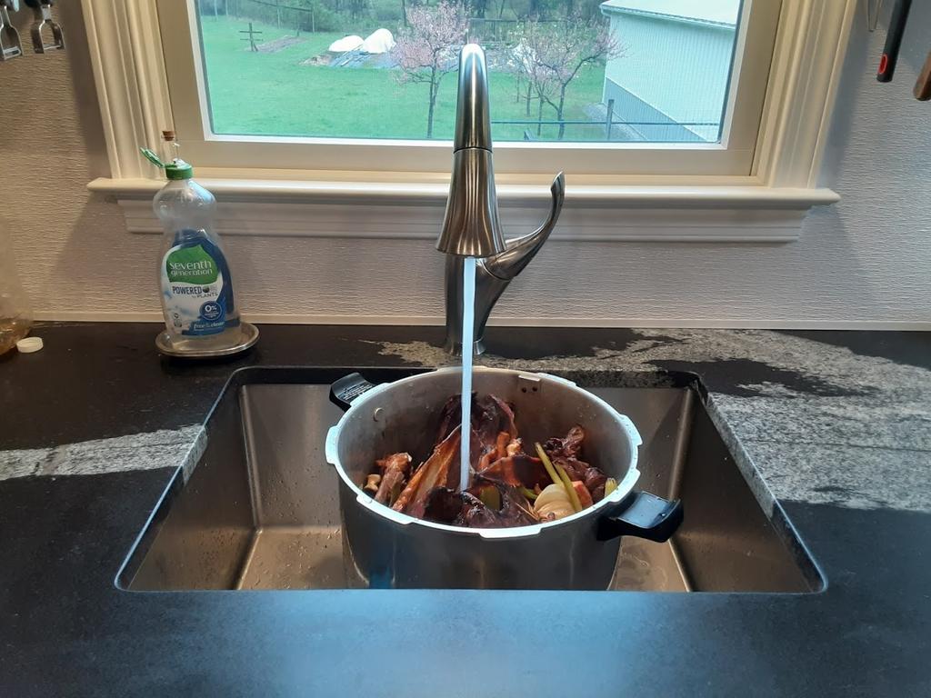 Carcass going into the pressure cooker to make stock. It will be on the stove for an hour at pressure.