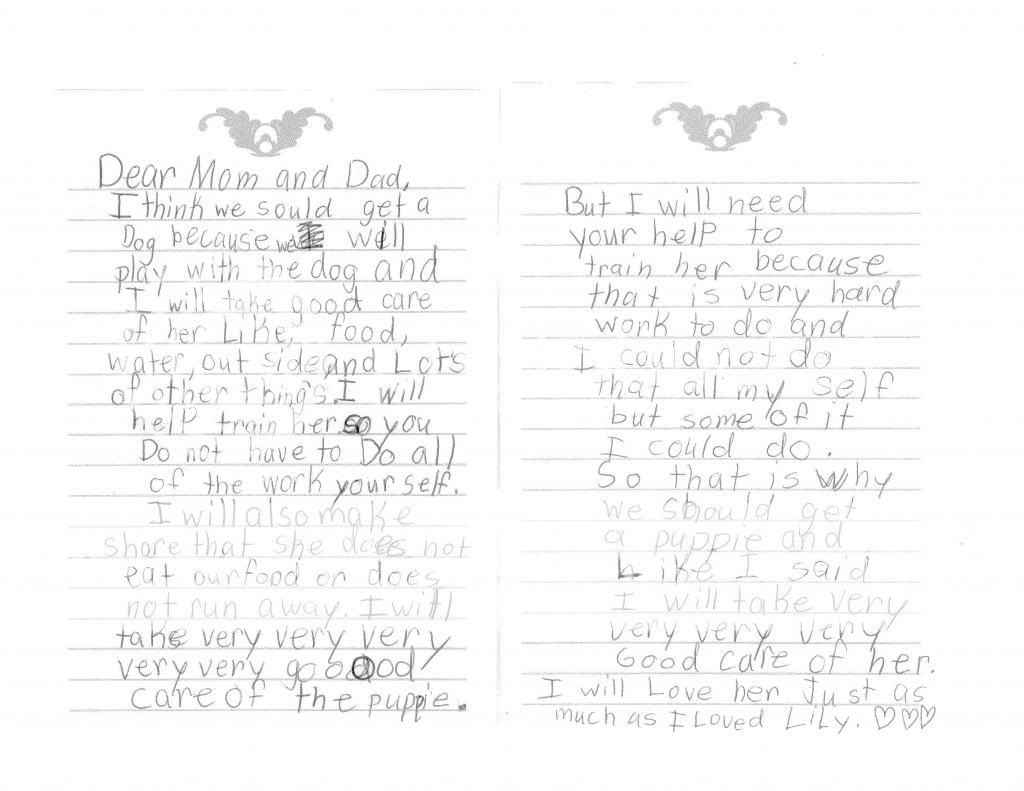 My 8 year old has been begging us to get a puppy and even wrote a letter and a power point why we should get a puppy.